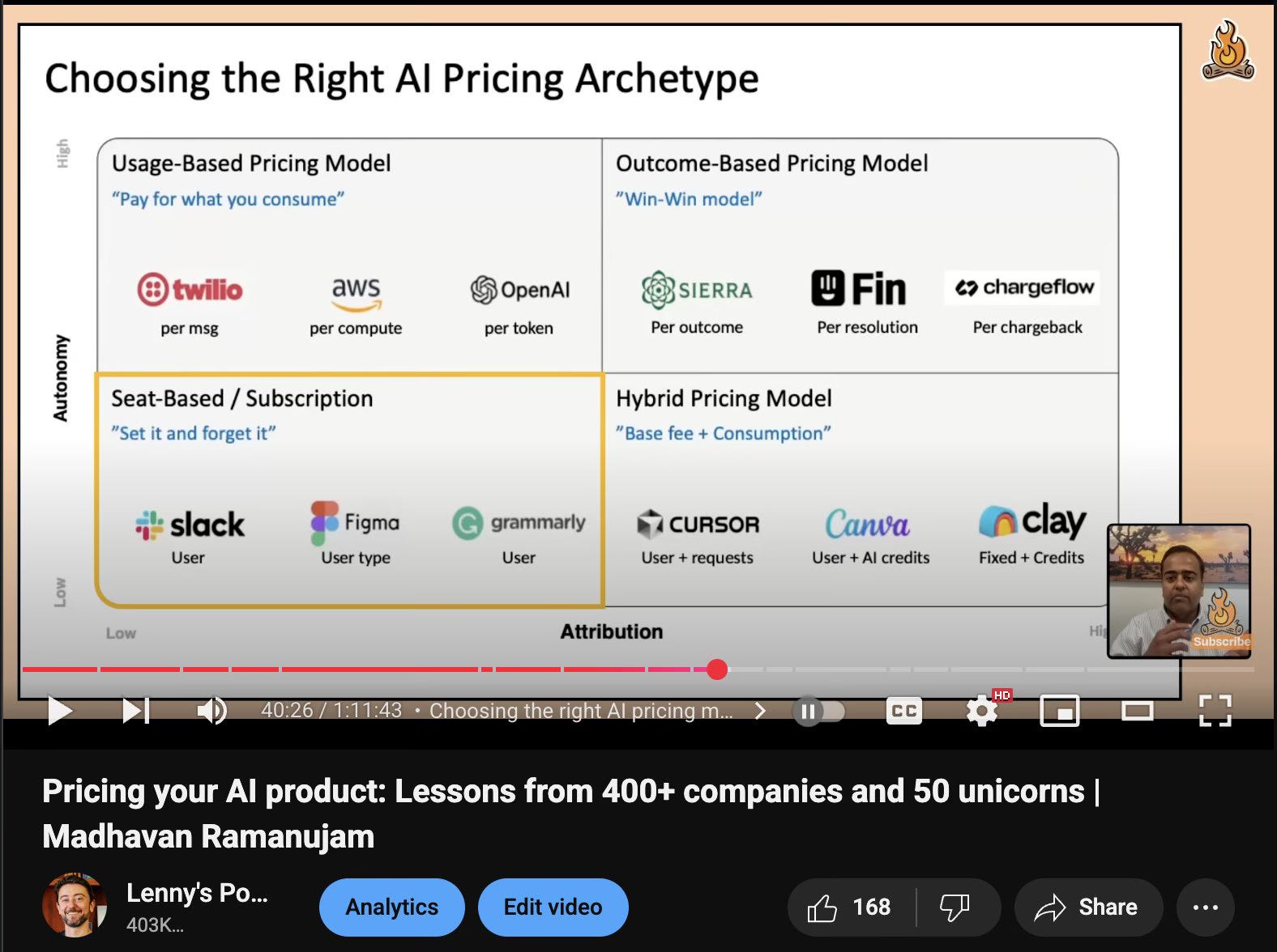 His 2x2 framework maps the ideal pricing model to how customers actually realize value, avoiding the common mistake of pricing based on features rather than outcomes.